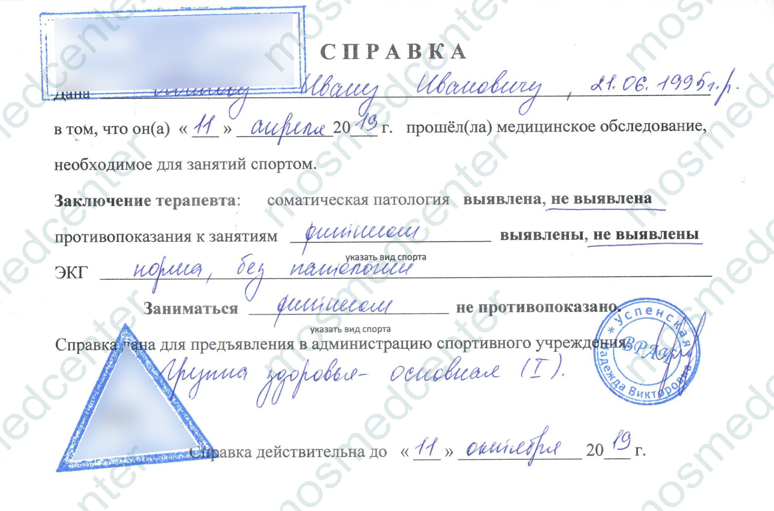 Взрослому человеку справку выдает терапевт, а ребенку — педиатр. Данная справка гарантирует, что человек не имеют хронических тяжелых заболеваний, а также болезней передающихся контактно-бытовым путем. Также медсправка подвтерждает способность спортсмена к повышенным физическим нагрузкам.